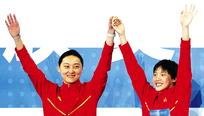 于子迪(右)和教练在游泳女子200米个人混合泳颁奖仪式上庆祝。 十五运官网